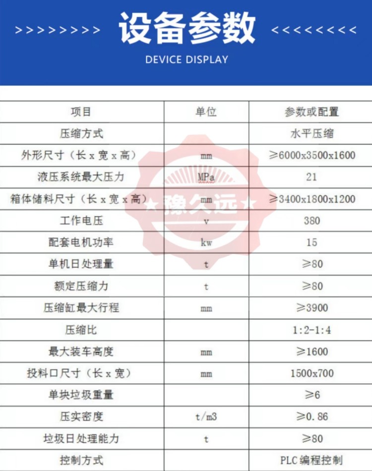 ◇平穩可靠:兩側舉升,剪叉跨度大,升降平穩,無傾斜; ◇淺地坑:地坑深度僅為1.55m,保潔及維修極為方便; ◇高效率:壓實每噸垃圾時間≤10min; ◇全封閉水平壓縮:采用水平壓縮方式,垃圾壓縮密度≥0.86t/m3,垃圾壓縮后體積大大減小,從而大幅度提高轉運車輛裝載量和轉運效率,降低垃圾處理、轉運等費用; ◇動作少,故障率低,整套設備的垃圾壓縮、裝車由三個動作完成,簡單實用,各動作之間安全互鎖,防止操作人員誤操作造成安全事故,安全可靠; ◇垃圾儲存、壓縮及寄存全部在地面以下,地面上沒有垃圾散落,對環境影響較小,環保性好;垃圾壓縮后密度高,水份少,可避免汽車運輸中的垃圾散落、污水滴漏現象,避免二次污染; ◇土建費用低,占地面積小,可以不蓋大型工作間,既節約了投資,也縮短了工期; ◇留有專門的維修窗口,維修保養方便; ◇設有固定式操作和遙控器兩種操作模式,方便實用; ◇自動化程度高,可大幅提高工作效率,降低勞動強度。